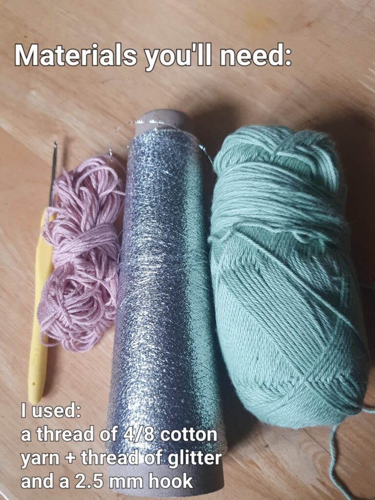 For the vine, I used a thread of Søstrene Grene’s green 8/4 cotton yarn combined with Hobbii’s Glitter Deluxe. For the flowers, I used a thread of Hobbii’s soft bamboo fine yarn, again combined with Hobbii’s Glitter Deluxe. Both the bamboo and cotton yarn are soft, though the cotton keeps its shape better.
