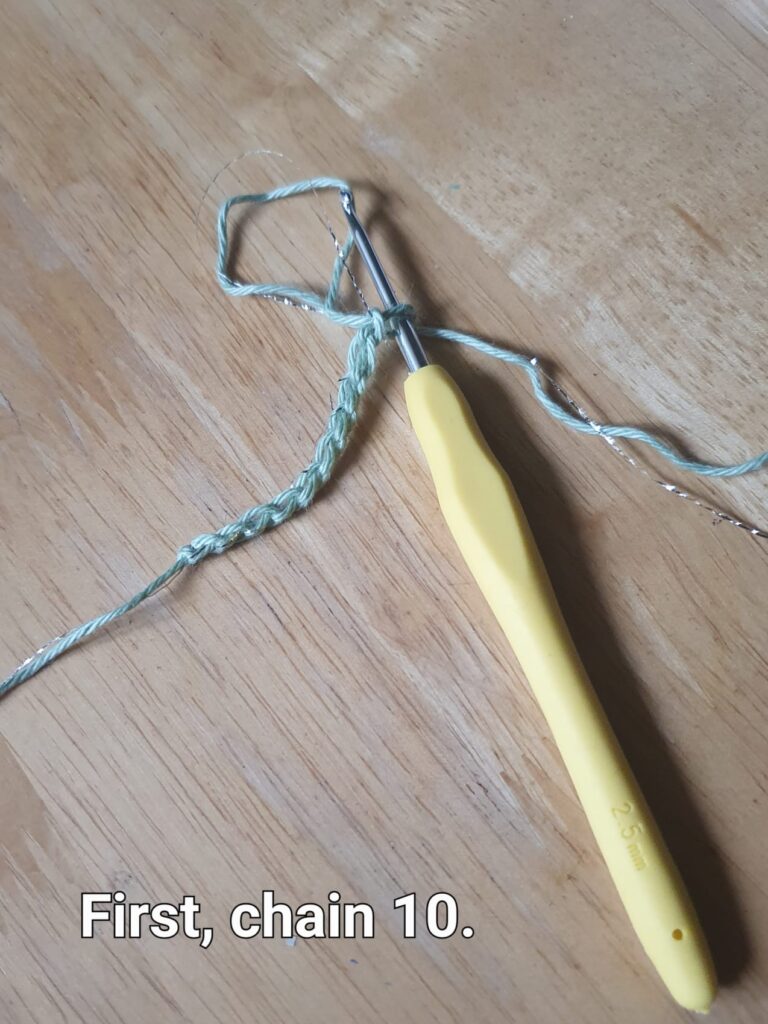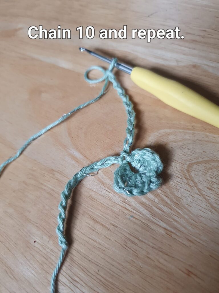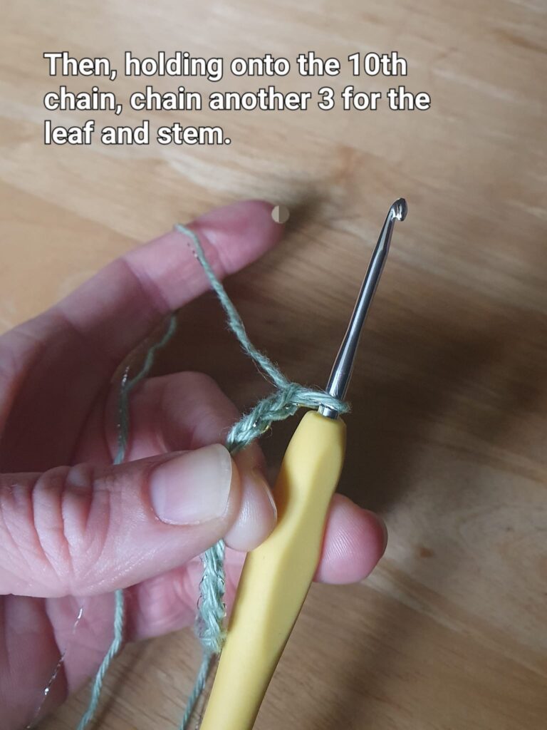 Then, holding on to the 10th chain, chain another 3 for the leaf and stem.