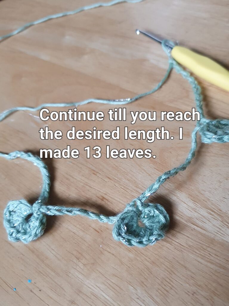 Continue till your crochet flower hair vine reaches the desired length (depends on how long your hair is). I made 13 leaves.