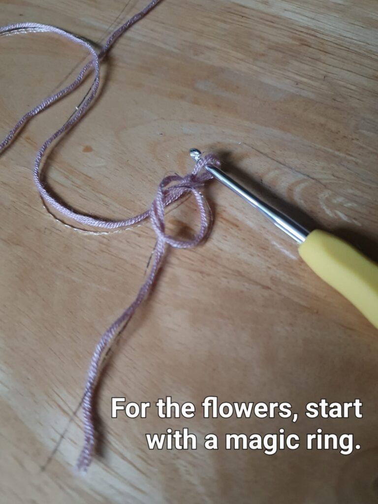 For the flowers, start with a magic ring. Here’s a video tutorial showing how to a magic ring (it gets a lot easier with practice, I promise!).
