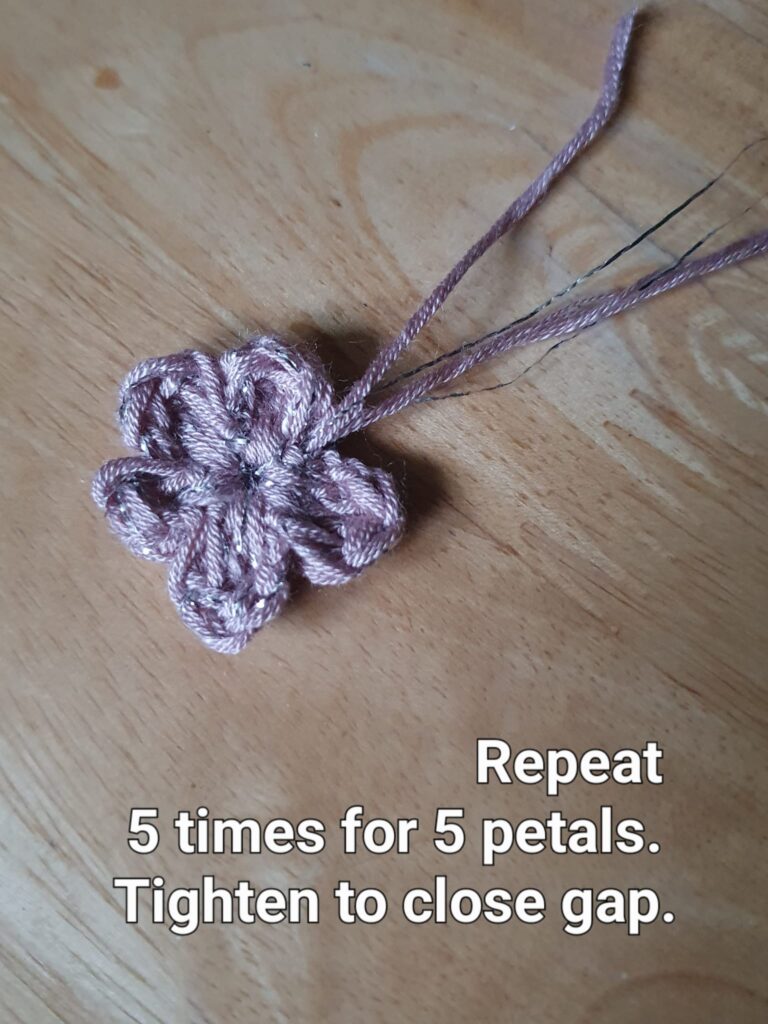 Repeat 5 times for 5 petals. Tighten to close the gap. Do not cut the yarn.