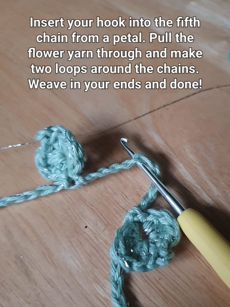 Once you’ve finished either one or all of your petals, you can insert your hook in the 5th chain from any given petal as pictured above. Pull the flower yarn ends through the chain and make two loops around the chains.