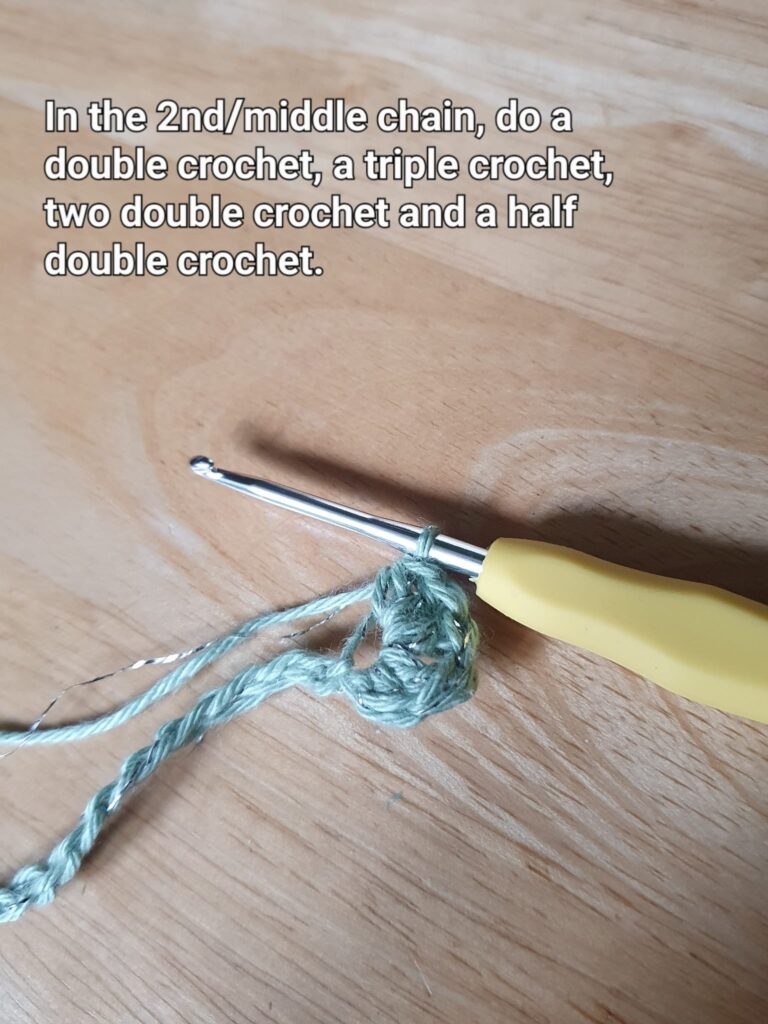 In the 2nd/middle chain, do a double crochet, a triple (also known as treble) crochet, two double crochet and a half double crochet. (If you are unfamiliar with these stitches, here’s a tutorial showing each one).