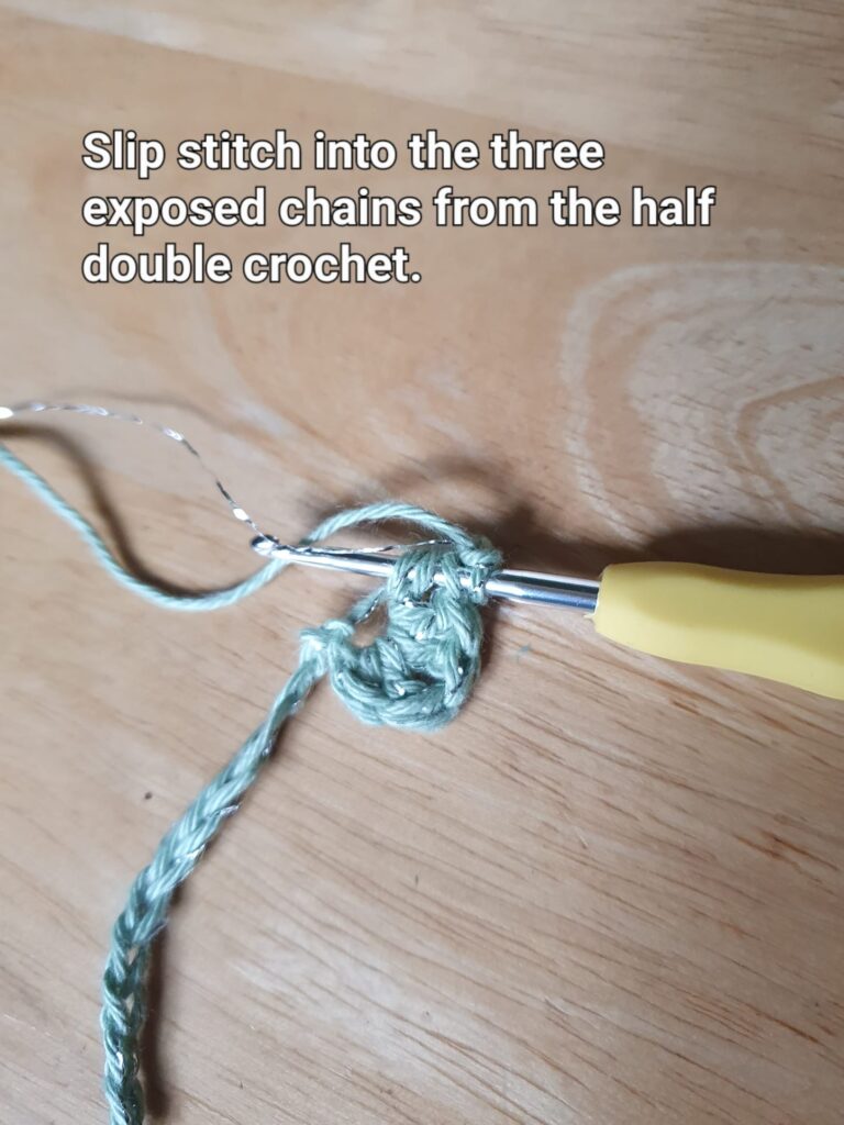 Slip-stitch into the 3 exposed chains from the half double crochet.