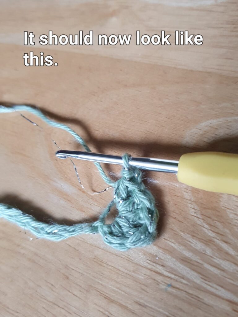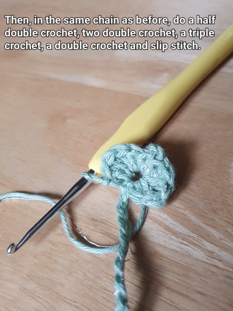 Then, in the same chain as before (2nd/middle chain of the 3 chains), do a half double crochet, two double crochet, a triple crochet, a double crochet and slip-stitch.
