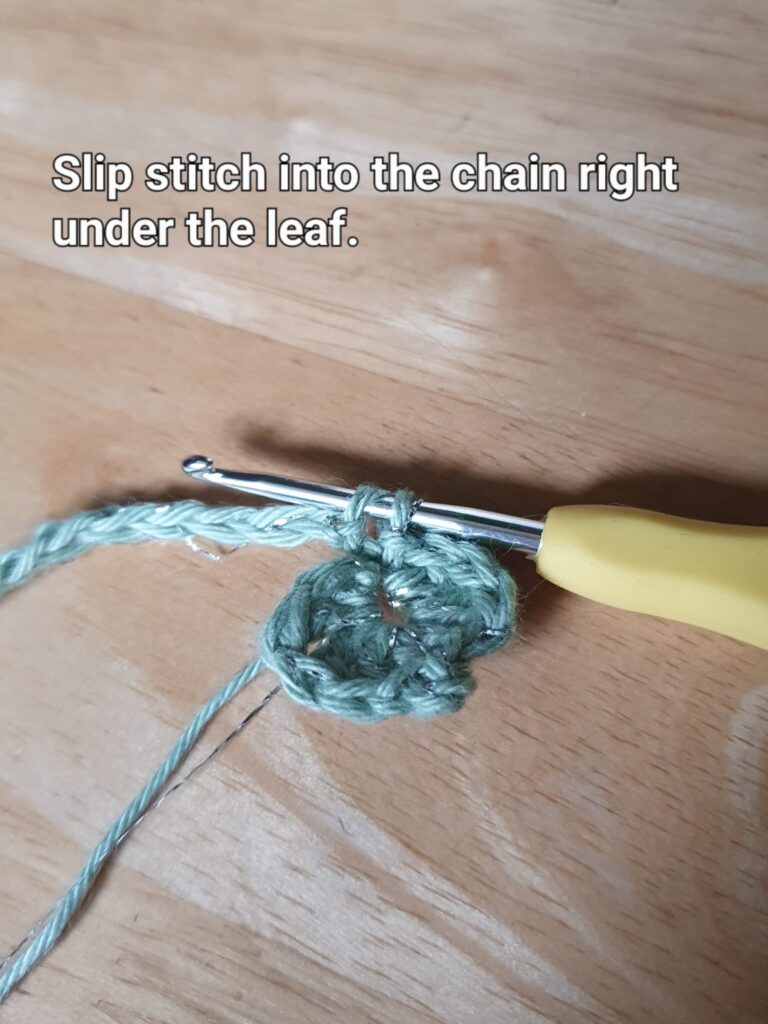Slip-stitch into the chain right under the leaf.